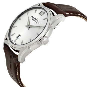 Stainless steel case with a brown leather strap. Fixed stainless steel bezel. Silver dial with luminous silver-tone hands and stick hour markers. An Arabic numeral appears at the 12 o'clock positionn. Dial Type: Analog. Luminescent hands. Date display at the 6 o'clock position. ETA caliber 2892-A2 automatic movement with a 42-hour power reserve. Scratch resistant sapphire crystal. Pull / push crown. Skeleton case back. Round case shape, case size: 40 mm, case thickness: 8.3 mm. Band width: 20 mm, band length: 8.5 inches. Tang clasp. Water resistant at 30 meters / 100 feet. Functions: date, hour, minute. Luxury watch style. Watch label: Swiss Made. Item Variations: H38515555. Hamilton Jazzmaster Series Silver Dial Men's Watch H38515555.