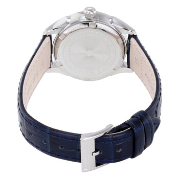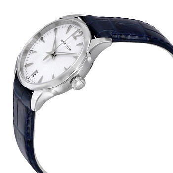 Stainless steel case with a blue leather strap. Fixed stainless steel bezel. Silver dial with luminous silver-tone hands and index hour markers. An Arabic numeral appears at the 12 o'clock position. Minute markers around the outer rim. Dial Type: Analog. Luminescent hands. Date display at the 6 o'clock position. Caliber F05.111 quartz movement. Scratch resistant sapphire crystal. Pull / push crown. Solid case back. Case size: 30 mm. Case thickness: 9 mm. Round case shape. Band width: 15 mm. Tang clasp. Water resistant at 50 meters / 165 feet. Functions: date, hour, minute, second, battery eol indicator. Dress watch style. Watch label: Swiss Made. Hamilton Jazzmaster Silver Dial Blue Leather Ladies Watch H42211655.