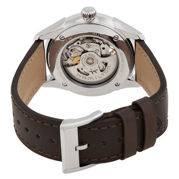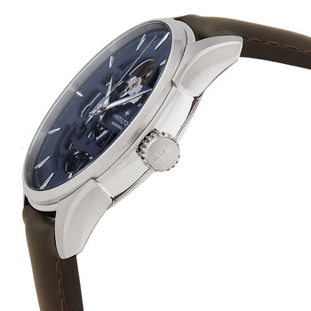 Silver-tone stainless steel case with a brown leather strap. Fixed silver-tone stainless steel bezel. Blue dial with silver-tone hands and index hour markers. Minute markers around the outer rim. Dial Type: Analog. Hamilton Calibre H-10-S Automatic movement, based upon ETA C07.111, containing 25 Jewels, bitting at 21600 vph, and has a power reserve of approximately 80 hours. Scratch resistant sapphire crystal. Pull / push crown. Transparent case back. Round case shape, case size: 40 mm, case thickness: 11.05 mm. Band width: 20 mm. Buckle clasp. Water resistant at 50 meters / 165 feet. Functions: hour, minute, second. Jazzmaster Series. Sport watch style. Watch label: Swiss Made. Hamilton Jazzmaster Skeleton Automatic Blue Dial Men's Watch H42535541.