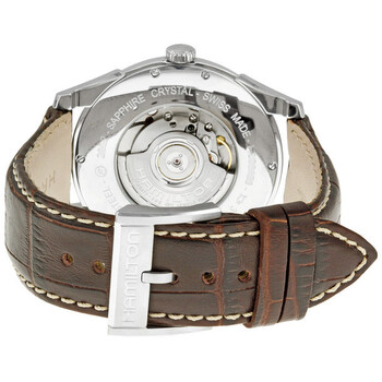 Stainless steel case with a brown (calfskin) leather strap. Fixed stainless steel bezel. Silver dial with luminous silver-tone hands and index hour markers. An Arabic numeral appears at the 12 o'clock position. Dial Type: Analog. Luminescent hands. Date display at the 6 o'clock position. ETA caliber 2892-A2 automatic movement with a 42-hour power reserve. Scratch resistant sapphire crystal. Pull / push crown. Skeleton case back. Round case shape. Case size: 43 mm. Case thickness: 8 mm. Band width: 22 mm. Tang clasp. Water resistant at 30 meters / 100 feet. Functions: hours, minutes, date. Additional Info: withstands rain and splashes of water, but not showering or submersion. Casual watch style. Watch label: Swiss Made. Hamilton Jazzmaster Slim Automatic Silver Dial Men's Watch H38615555.