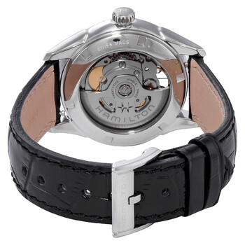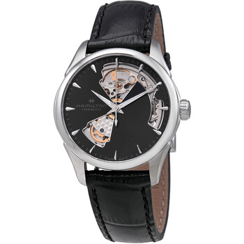 Stainless steel case with a black (calfskin) leather strap. Fixed stainless steel bezel. Black skeleton dial with luminous silver-tone hands and index hour markers. Minute markers around the outer rim. Dial Type: Analog. Luminescent hands and markers. Caliber H-10 automatic movement with an 80-hour power reserve. Scratch resistant sapphire crystal. Pull / push crown. Transparent case back. Round case shape. Case size: 36 mm. Case thickness: 10 mm. Band width: 18 mm. Tang clasp. Water resistant at 50 meters / 165 feet. Functions: hour, minute, second. Jazzmaster Viewmatic Series. Dress watch style. Watch label: Swiss Made. Hamilton Jazzmaster Viewmatic Automatic Black Skeleton Dial Ladies Watch H32215730.