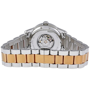 Stainless steel case with a two-tone (silver and rose gold-tone) stainless steel bracelet. Fixed rose gold-tone bezel. Silver dial with rose gold-tone hands and index hour markers. Minute markers around the outer rim. Dial Type: Analog. Date display at the 3 o'clock position. Automatic movement. Scratch resistant sapphire crystal. Skeleton case back. Case diameter: 34 mm. Deployment clasp. Water resistant at 50 meters / 165 feet. Functions: hours, minutes, seconds, date. Hamilton Jazzmaster Viewmatic Automatic Ladies Watch H32305191.