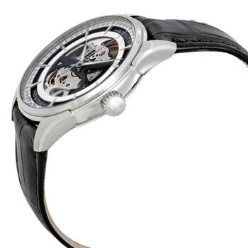 Stainless steel case with a black leather strap. Fixed stainless steel bezel. Skeleton dial with luminous silver-tone hands and index hour markers. Arabic numeral minute markers (at 5 minute intervals). Minute markers around the outer rim. Dial Type: Analog. Luminescent hands and markers. Hamilton calibre H-20-S automatic movement with a 40-hour power reserve. Scratch resistant sapphire crystal. Pull / push crown. Skeleton case back. Round case shape. Case size: 40 mm. Case thickness: 11 mm. Band width: 18 mm. Band length: 7.5 inches. Tang clasp. Water resistant at 100 meters / 330 feet. Functions: hour, minute, second. Jazzmaster Viewmatic Series. Casual watch style. Watch label: Swiss Made. Hamilton Jazzmaster Viewmatic Automatic Men's Watch H42555751.