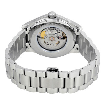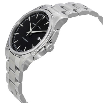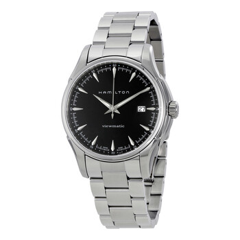 Silver-tone stainless steel case with a silver-tone stainless steel bracelet. Fixed silver-tone stainless steel bezel. Black dial with luminous silver-tone hands and index hour markers. Minute markers around the outer rim. Dial Type: Analog. Luminescent hands and markers. Date display at the 3 o'clock position. Hamilton Calibre H-10 automatic movement with an 80-hour power reserve. Scratch resistant sapphire crystal. Textured steel crown. Skeleton case back. Round case shape, case size: 40 mm, case thickness: 11 mm. Band width: 20 mm. Deployment clasp. Water resistant at 50 meters / 165 feet. Functions: date, hour, minute, second. Casual watch style. Watch label: Swiss Made. Hamilton Jazzmaster Viewmatic Black Dial Men's Watch H32665131.