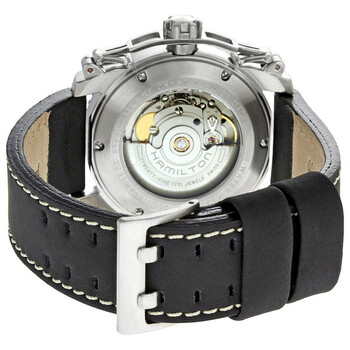 Stainless steel case with a leather bracelet. Rotating bezel bezel. Black dial with luminous hands and Arabic and stick hour markers. Minute markers around the outer rim. Luminescent hands. Date displays at the 3 o'clock position. Automatic movement. Scratch resistant sapphire crystal. Case diameter: 40 mm. Tang clasp. Water resistant at 200 meters/ 660 feet. Functions: hours/ minutes/ seconds/ date. Hamilton Khaki Action Men's Watch H62455735.