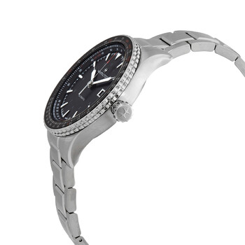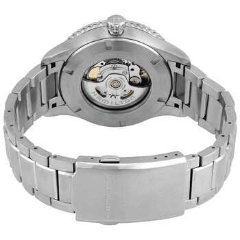 Silver-tone stainless steel case and bracelet. Bi-directional rotating silver-tone stainless steel bezel with an inlaid black ring. Black dial with silver-tone hands and index hour markers. Minute markers. Tachymeter markings. Conversion scale around the outer rim. Dial Type: Analog. Luminescent hands and markers. Date display at the 3 o'clock position. Hamilton Calibre H-10 Automatic movement, based upon ETA C07.111, containing 25 Jewels, bitting at 21600 vph, and has a power reserve of approximately 80 hours. Scratch resistant sapphire crystal. Pull / push crown. Transparent see through case back. Round case shape, case size: 42 mm, case thickness: 11 mm. Folding clasp. Water resistant at 100 meters / 330 feet. Functions: date, hour, minute, second. Khaki Aviation Series. Sport watch style. Watch label: Swiss Made. Hamilton Khaki Aviation Automatic Black Dial Men's Watch H76615130.