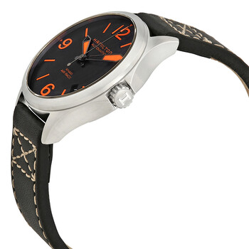Stainless steel case with a black leather strap. Fixed stainless steel bezel. Black dial with luminous orange hands and index hour markers. Arabic numerals mark the 3, 6, 9 and 12 o'clock positions. Minute markers around the outer rim. Dial Type: Analog. Luminescent hands and markers. Date display between the 4 and 5 o'clock positions. Hamilton calibre H-10 automatic movement, based upon ETA C07.111, containing 25 Jewels, bitting at 21600 vph, and has a power reserve of approximately 80 hours. Scratch resistant sapphire crystal. Pull / push crown. Transparent case back. Round case shape. Case size: 38 mm. Case thickness: 11 mm. Band width: 19 mm. Tang clasp. Water resistant at 50 meters / 165 feet. Functions: date, hour, minute, second. Casual watch style. Watch label: Swiss Made. Hamilton Khaki Aviation Automatic Black Dial Watch H76235731.