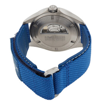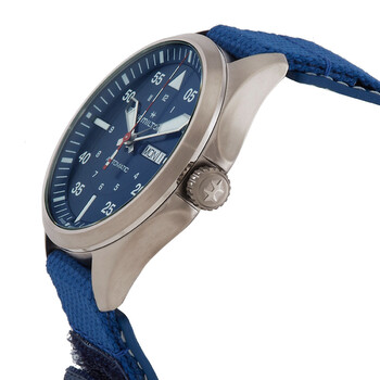 Silver-tone titanium case with a blue textile strap. Fixed silver-tone bezel. Blue dial with silver-tone hands and Arabic numeral hour markers. Minute scale around the inner rim. Dial Type: Analog. Luminescent hands and markers. Day and date display at the 3 o'clock position. Hamilton Calibre H-30 Automatic movement, based upon ETA C07.111, containing 25 Jewels, bitting at 21600 vph, and has a power reserve of approximately 80 hours. Scratch resistant sapphire crystal. Transparent case back. Round case shape, case size: 42 mm, case thickness: 12.1 mm. Band width: 20 mm. Folding clasp. Water resistant at 100 meters / 330 feet. Functions: date, day, hour, minute, second. Khaki Aviation Series. Sport watch style. Watch label: Swiss Made. Hamilton Khaki Aviation Automatic Blue Dial Men's Watch H64655941.