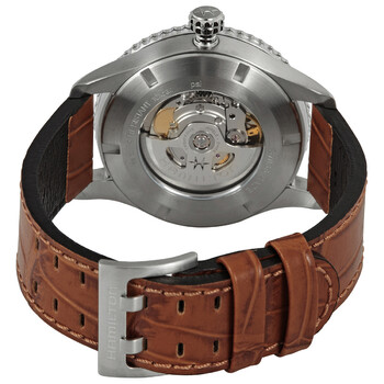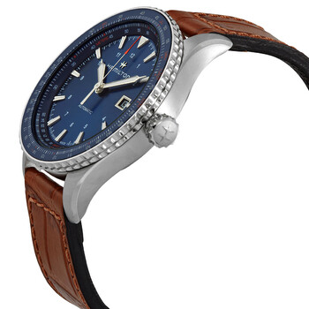 Stainless steel case with a brown (cow) leather strap. Uni-directional rotating stainless steel bezel. Blue dial with luminous silver-tone hands and index / small Arabic numeral hour markers. Minute markers. Conversion scale around the outer rim. Dial Type: Analog. Luminescent hands and markers. Date display at the 3 o'clock position. Hamilton calibre H-10 automatic movement, based upon ETA C07.111, containing 25 Jewels, bitting at 21600 vph, and has a power reserve of approximately 80 hours. Scratch resistant sapphire crystal. Transparent case back. Round case shape, case size: 42 mm. Band width: 20 mm. Tang clasp. Water resistant at 100 meters / 330 feet. Functions: date, hour, minute, second. Khaki Aviation Series. Sport watch style. Watch label: Swiss Made. Hamilton Khaki Aviation Automatic Blue Dial Men's Watch H76645540.