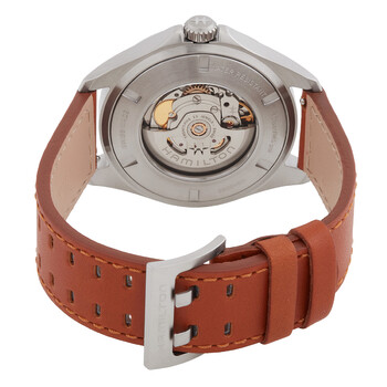 Silver-tone stainless steel case with a brown leather strap. Fixed silver-tone stainless steel bezel. Silver dial with silver-tone hands and index-Arabic numeral hour markers. Minute scale around the inner rim. Dial Type: Analog. Luminescent hands and markers. Day and date display at the 3 o'clock position. One subdial displaying: one- 12 hour inner scale. Hamilton Calibre H-30 Automatic movement, based upon ETA C07.111, containing 25 Jewels, bitting at 21600 vph, and has a power reserve of approximately 80 hours. Scratch resistant sapphire crystal. Transparent see through case back. Round case shape, case size: 42 mm, case thickness: 12.1 mm. Band width: 20 mm. Buckle clasp. Water resistant at 100 meters / 330 feet. Functions: date, day, hour, minute, second. Khaki Aviation Series. Sport watch style. Watch label: Swiss Made. Hamilton Khaki Aviation Automatic Silver Dial Men's Watch H64635550.
