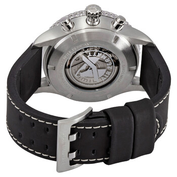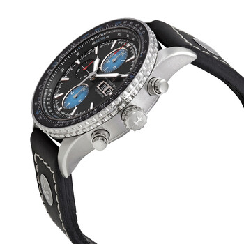 Stainless steel case with a black leather strap. Bi-directional rotating stainless steel bezel. Black dial with luminous silver-tone hands and index hour markers. Conversion marrkers. Minute markers. Tachymeter markings around an inner ring. Minute markers around the outer rim. Dial Type: Analog. Luminescent hands and markers. Day of the week and date display at the 3 o'clock position. Chronograph - three sub-dials displaying: 60 second, 30 minute and 12 hour. Hamilton calibre H-21-SI automatic movement with a 60-hour power reserve. Scratch resistant sapphire crystal. Screw down crown. Solid case back. Round case shape. Case size: 44 mm. Case thickness: 14 mm. Band width: 22 mm. Tang clasp. Water resistant at 100 meters / 330 feet. Functions: chronograph, hour, minute, second. Khaki Aviation Series. Sport watch style. Watch label: Swiss Made. Hamilton Khaki Aviation Chronograph Automatic Black Dial Men's Watch H76706730.