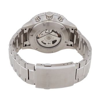 Silver-tone stainless steel case and bracelet. Bi-directional rotating blue stainless steel bezel. Blue dial with silver-tone hands and index hour markers. Tachymeter scale around the outer rim. Dial Type: Analog. Luminescent hands and markers. Day of the week and date display at the 3 o'clock position. Hamilton Calibre H-21-Si automatic movement with a 60-hour power reserve. Scratch resistant sapphire crystal. Screw down crown. Solid case back. Round case shape, case size: 44 mm, case thickness: 14.6 mm. Band width: 22 mm. Fold over clasp. Water resistant at 100 meters / 330 feet. Functions: chronograph, date, hour, minute, second. Khaki Aviation Series. Sport watch style. Watch label: Swiss Made. Hamilton Khaki Aviation Chronograph Automatic Blue Dial Watch H76746140.