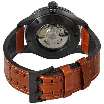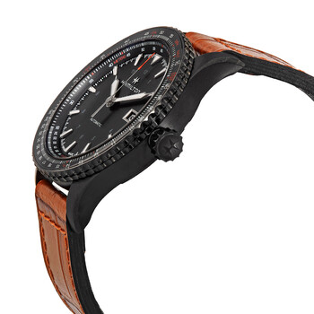Black-plated stainless steel case with a brown leather strap. Bi-directional rotating black-plated bezel. Black dial with silver-tone hands and index / small Arabic numeral hour markers. Minute markers. Conversion / consumption scale around the outer rim. Dial Type: Analog. Luminescent hands and markers. Date display at the 3 o'clock position. Hamilton calibre H-10 automatic movement, based upon ETA C07.111, containing 25 Jewels, bitting at 21600 vph, and has a power reserve of approximately 80 hours. Scratch resistant sapphire crystal. Screw down crown. Transparent case back. Round case shape. Case size: 42 mm. Case thickness: 10.9 mm. Band width: 20 mm. Tang clasp. Water resistant at 100 meters / 330 feet. Functions: date, hour, minute, second. Khaki Aviation Series. Luxury watch style. Watch label: Swiss Made. Hamilton Khaki Aviation Automatic Black Dial Men's Watch H76625530.