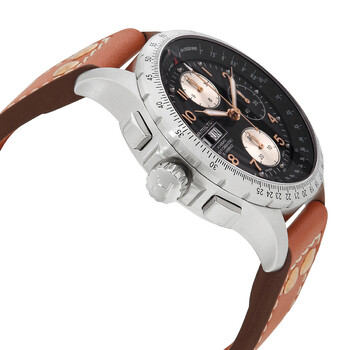 Silver-tone stainless steel case with a brown leather strap. Black dial with rose gold-tone hands and Arabic numeral hour markers. Dial Type: Analog. Date display at the 9 o'clock position. Automatic movement. Scratch resistant sapphire crystal. Round case shape, case size: 44 mm. Folding clasp. Water resistant at 100 meters / 330 feet. Functions: chronograph, date, day of the week, hour, minute, second. Khaki Aviation Khaki X-wind Series. Dress watch style. Watch label: Swiss Made. Hamilton Khaki Aviation Khaki X-Wind Black Dial Automatic Men's Watch H89656533.
