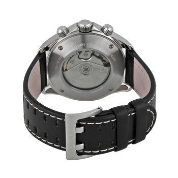 Silver-tone stainless steel case with a black leather strap. Fixed silver-tone stainless steel bezel. Black dial with silver-tone hands and Arabic numeral hour markers. Minute markers around the outer rim. Dial Type: Analog. Luminescent hands and markers. Date display at the 6 o'clock position. Chronograph - three sub-dials displaying: 60 second, 30 minute and 1/10th of a second. Hamilton Calibre H-31 Automatic movement, based upon ETA 7753, containing 27 Jewels, bitting at 28800 vph, and has a power reserve of approximately 60 hours. Scratch resistant sapphire crystal. Screw down crown. Transparent case back. Round case shape, case size: 42 mm, case thickness: 16 mm. Band width: 20 mm, band length: 7 inches. Tang clasp. Water resistant at 50 meters / 165 feet. Functions: chronograph, date, hour, minute, second. Khaki Aviation Series. Pilot watch style. Watch label: Swiss Made. Hamilton Khaki Aviation Pilot Auto Chrono Watch H64666735.