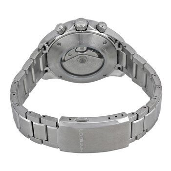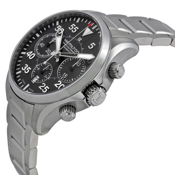 Silver-tone stainless steel case with a silver-tone stainless steel bracelet. Fixed silver-tone stainless steel bezel. Black dial with luminous hands and Arabic numeral hour markers. Minute markers around the outer rim. Dial Type: Analog. Luminescent hands and markers. Date display at the 6 o'clock position. Chronograph - three sub-dials displaying: 60 second, 30 minute and 12 hour. Hamilton Calibre H-31 Automatic movement, based upon ETA 7753, containing 27 Jewels, bitting at 28800 vph, and has a power reserve of approximately 60 hours. Scratch resistant sapphire crystal. Transparent case back. Round case shape, case size: 42 mm, case thickness: 16 mm. Band width: 20 mm. Deployment clasp. Water resistant at 200 meters / 660 feet. Functions: chronograph, date, hour, minute, second. Khaki Series. Pilot watch style. Watch label: Swiss Made. Hamilton Khaki Aviation Pilot Automatic Chronograph Men's H64666135.