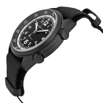 Black aluminium case with a black canvas NATO strap. Fixed outer black aluminium bezel. Black dial with luminous hands and Arabic numeral hour markers. 24 hour markers. Arabic numeral minute markers (at 5 minute intervals). Minute markers around the outer rim. Dial Type: Analog. Luminescent hands and markers. Date display at the 3 o'clock position. Hamilton calibre H-10 automatic movement, based upon ETA C07.111, containing 25 Jewels, bitting at 21600 vph, and has a power reserve of approximately 80 hours. Scratch resistant sapphire crystal. Screw down crown. Transparent case back. Round case shape. Case size: 41 mm. Case thickness: 12.7 mm. Band width: 22 mm. Band length: 7.5 inches. Tang clasp. Water resistant at 100 meters / 330 feet. Functions: date, hour, minute, second, 24 hour. Additional Info: internal rotating bezel operated by second crown. Khaki Aviation Series. Pilot watch style. Watch label: Swiss Made. Hamilton Khaki Aviation Pilot Pioneer Automatic Men's Watch H80485835.