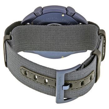 Blue aluminium case with a blue NATO canvas strap. Fixed outer blue aluminium bezel. Blue dial with luminous hands and Arabic numeral hour markers. 24 hour markers. Minute markers around the outer rim. Dial Type: Analog. Luminescent hands and markers. Date display at the 3 o'clock position. Automatic movement with an 80-hour power reserve. Scratch resistant sapphire crystal. Screw down crown. Transparent case back. Case diameter: 41 mm. Case thickness: 12.7 mm. Round case shape. Band width: 22 mm. Tang clasp. Water resistant at 100 meters / 330 feet. Functions: date, hour, minute, second, 24 hour. Additional Info: internal rotating bezel operated by second crown. Casual watch style. Hamilton Khaki Aviation Pilot Pioneer Automatic Blue Dial Blue NATO Fabric Men's Watch H80495845.
