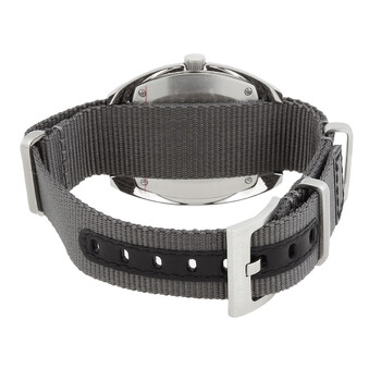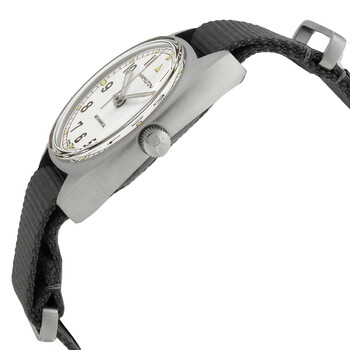 Silver-tone stainless steel case with a grey nylon strap. Fixed silver-tone stainless steel bezel. Silver-tone dial with silver-tone hands and Arabic numeral hour markers. Minute markers around the outer rim. Dial Type: Analog. Luminescent hands and markers. Hamilton Calibre H-50 Hand Wind movement, based upon ETA 2801-2, containing 17 Jewels, bitting at 21600 vph, and has a power reserve of approximately 80 hours. Scratch resistant mineral crystal. Round case shape, case size: 36 mm. Buckle clasp. Water resistant at 100 meters / 330 feet. Functions: hour, minute, second. Khaki Aviation Pilot Pioneer Mechanical Series. Casual watch style. Watch label: Swiss Made. Hamilton Khaki Aviation Pilot Pioneer Mechanical Hand Wind Silver Dial Men's Watch H76419951.