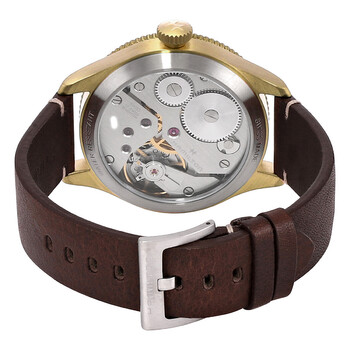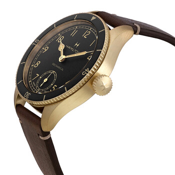 Bronze and titanium case with a brown leather strap. Bi-directional rotating black bezel. Black dial with bronze hands and Arabic numeral hour markers. Minute markers around the outer rim. Dial Type: Analog. Luminescent hands and markers. One subdial displaying: small second. ETA Caliber 6498-1 Hand Wind movement, containing 17 Jewels, bitting at 19800 vph, and has a power reserve of approximately 46 hours. Scratch resistant sapphire crystal. Pull / push crown. Transparent see through case back. Round case shape, case size: 43 mm. Band width: 18 mm. Tang clasp. Water resistant at 100 meters / 330 feet. Functions: hour, minute, small second. Khaki Aviation Pioneer Series. Casual watch style. Watch label: Swiss Made. Hamilton Khaki Aviation Pioneer Hand Wind Black Dial Men's Watch H76709530.