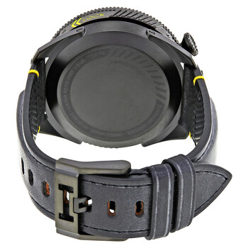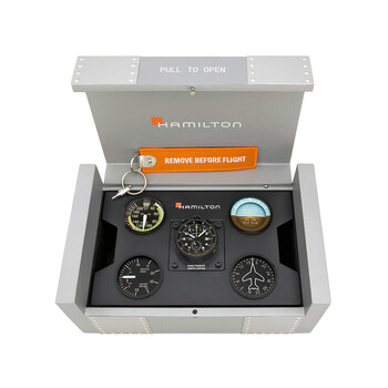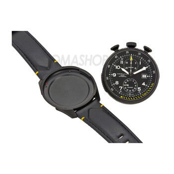 Black PVD stainless steel case with a black leather strap. Fixed black PVD bezel. Black dial with luminous hands and Arabic numeral hour markers. Minute markers around the outer rim. Dial Type: Analog. Luminescent hands and markers. Date display at the 3 o'clock position. Chronograph - two sub-dials displaying: 60 second and 30 minute. Automatic movement with a 60-hour power reserve. Scratch resistant sapphire crystal. Screw down crown. Transparent case back. Case diameter: 46 mm. Case thickness: 16 mm. Round case shape. Band width: 22 mm. Tang clasp. Water resistant at 50 meters / 165 feet. Functions: chronograph, date, hour, minute, second. Additional Info: Bi-directional turning flange - capacity to record a countdown. Casual watch style. Hamilton Khaki Aviation Takeoff Automatic Chronograph Black Dial Black Leather Men's Watch H76786733.
