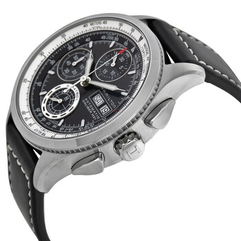 Stainless steel case with a black leather strap. Fixed stainless steel bezel. Black dial with silver-tone hands and index hour markers. Minute markers. nautical miles to statute miles conversion scale around the outer rim. Dial Type: Analog. Luminescent hands and markers. Day of the week and date display at the 3 o'clock position. Chronograph - three sub-dials displaying: 60 second, 30 minute and 12 hour. Hamilton calibre H-21 automatic movement with a 60-hour power reserve. Scratch resistant sapphire crystal. Screw down crown. Skeleton case back. Case size: 42 mm. Case thickness: 16 mm. Round case shape. Band width: 20 mm. Band length: 7.5 inches. Fold over clasp with a safety release. Water resistant at 100 meters / 330 feet. Functions: chronograph, date, hour, minute, second. Casual watch style. Watch label: Swiss Made. Hamilton Khaki Aviation X-Patrol Chronograph Men's Watch H76556731.