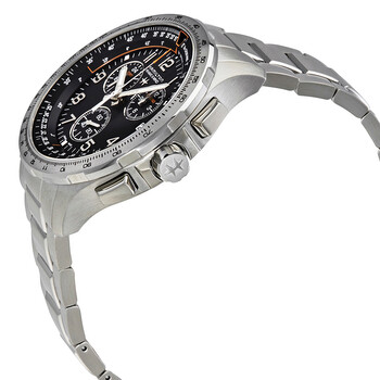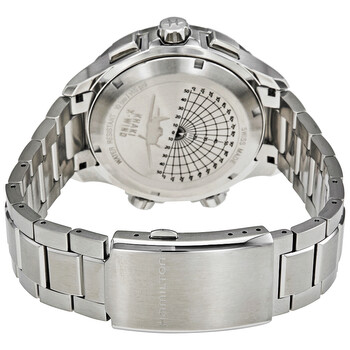 Stainless steel case with a stainless steel bracelet. Bi-directional rotating stainless steel bezel. Black dial with luminous silver-tone hands and Arabic numeral hour markers. Minute markers. Air speed markings around the outer rim. Dial Type: Analog. Luminescent hands and markers. Date display at the 3 o'clock position. Chronograph - three sub-dials displaying: 60 seconds, 12 hours, and 24 hours. ETA caliber G10.962 quartz movement. Scratch resistant sapphire crystal. Screw down crown. Solid case back. Round case shape. Case size: 46 mm. Case thickness: 14 mm. Band width: 22 mm. Deployment clasp. Water resistant at 100 meters / 330 feet. Functions: chronograph, rattrapante, date, GMT, second time zone, hour, minute, small second. Dress watch style. Watch label: Swiss Made. Hamilton Khaki Aviation X-Wind Chronograph Men's Watch H77912135.