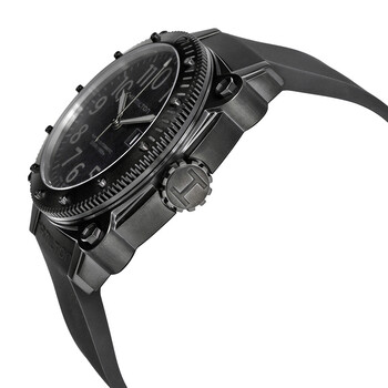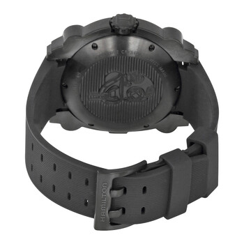 Black PVD steel case with a black rubber strap. Unidirectional rotating black PVD bezel. Black dial with luminous hands and Arabic numeral hour markers. Minute markers around the outer rim. Dial Type: Analog. Luminescent hands and markers. Date display at the 3 o'clock position. ETA caliber 2826-2 automatic movement with a 40-hour power reserve. Scratch resistant sapphire crystal. Screw down crown. Solid case back engraved with fish symbol and diving mask. Case size: 46 mm. Case thickness: 17 mm. Round case shape. Band width: 24 mm. Band length: 8.5 inches. Tang clasp. Water resistant at 1000 meters / 3300 feet. Functions: hours, minutes, seconds, calendar. Additional Info: interchangeable stainless steel PVD bracelet. Dive watch style. Watch label: Swiss Made. Item Variations: H78585333. Hamilton Khaki Belowzero Men's Watch H78585333.