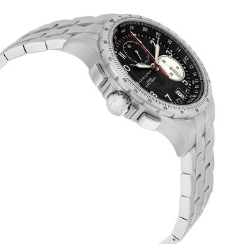 Stainless steel case with a stainless steel bracelet. Bi-directional rotating stainless steel bezel showing time, speed, distance markers. Black dial with luminous hands and Arabic numeral hour markers. Minute markers around the outer rim. Dial Type: Analog. Luminescent hands and dial markers. Date displays at the 3 o'clock position. Chronograph - two sub-dials displaying: 60 second and 30 minute. Quartz movement. Scratch resistant sapphier crystal. Screw down crown. Solid case back. Case diameter: 42 mm. Case thickness: 13 mm. Round case shape. Band width: 21 mm. Band length: 8.5 inches. Push button deployment clasp. Water resistant at 100 meters / 330 feet. Functions: hours/ minutes/ seconds/ date/ Chronograph with red flyback hand. Casual watch style. Watch label: Swiss Made. Hamilton Khaki ETO Men's Watch H77612133.