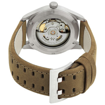 Titanium case with a leather strap. Fixed titanium bezel. Green dial with black hands and Arabic numeral hour markers. Minute markers around the outer rim. Dial Type: Analog. Luminescent hands and markers. Hamilton Calibre H-10 Automatic movement, based upon ETA C07.111, containing 25 Jewels, bitting at 21600 vph, and has a power reserve of approximately 80 hours. Scratch resistant sapphire crystal. Transparent case back. Round case shape, case size: 38 mm. Band width: 20 mm. Buckle clasp. Water resistant at 100 meters / 330 feet. Functions: hour, minute, second. Khaki Field Series. Sport watch style. Watch label: Swiss Made. Hamilton Khaki Field Automatic Green Dial Unisex Watch H70205860.