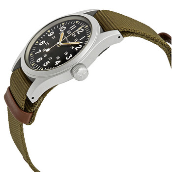 Stainless steel case with a green textile strap. Fixed stainless steel bezel. Black dial with silver-tone hands and Arabic numeral hour markers. 24 hour markers. Minute markers around the outer rim. Dial Type: Analog. Luminescent hands. ETA caliber 2801-2 hand wind movement with a 42-hour power reserve. Scratch resistant sapphire crystal. Solid case back. Round case shape. Case size: 38 mm. Case thickness: 9.5 mm. Band width: 20 mm. Tang clasp. Water resistant at 50 meters / 165 feet. Functions: hour, minute, second. Casual watch style. Watch label: Swiss Made. Hamilton Khaki Field Black Dial Men's Hand Wound Watch H69429931.