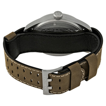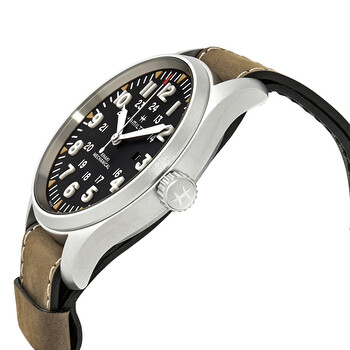 Stainless steel case with a brown (cow hide) leather strap. Fixed stainless steel bezel. Black dial with luminous silver-tone hands and Arabic numeral hour markers. 24 hour markers. Minute markers around the outer rim. Dial Type: Analog. Luminescent hands and markers. Date display at the 3 o'clock position. Hamilton calibre H-50 Hand Wind movement, based upon ETA 2801-2, containing 17 Jewels, bitting at 21600 vph, and has a power reserve of approximately 80 hours. Scratch resistant sapphire crystal. Solid case back. Round case shape. Case size: 50 mm. Case thickness: 12.55 mm. Band width: 24 mm. Tang clasp. Water resistant at 100 meters / 330 feet. Functions: date, hour, minute, second. Additional Info: limited edition of 550 pieces. Khaki Field Series. Casual watch style. Watch label: Swiss Made. Hamilton Khaki Field Black Dial Men's Limited Edition Hand Wound Watch H69819530.