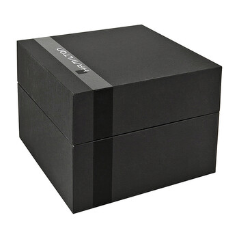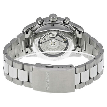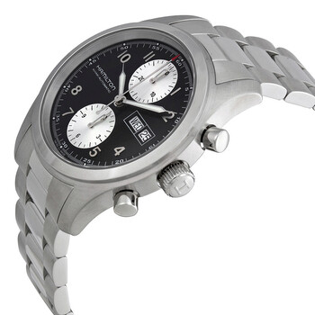 Stainless steel case with a stainless steel bracelet. Fixed stainless steel bezel. Black dial with luminous hands and Arabic numeral hour markers. Minute markers around the outer rim. Dial Type: Analog. Luminescent hands and markers. Day and date diaplay at the 3 o'clock position. Chronograph - two sub-dials displaying: 12 hours and 30 minutes. Automatic movement. Scratch resistant sapphire crystal. Skeleton case back. Case diameter: 42 mm. Deployment clasp. Water resistant at 100 meters/ 330 feet. Functions: hours, minutes, seconds, calendar, chronograph. Sport watch style. Hamilton Khaki Field Chronograph Automatic Men's Watch H71566133.