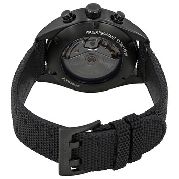 Black PVD stainless steel case with a black textile strap. Fixed black PVD bezel. Black dial with luminous black sword-shaped hands and Arabic numeral hour markers. 24 hour markers. Minute markers around the outer rim. Dial Type: Analog. Luminescent hands and markers. Day of the week and date display at the 3 o'clock position. Chronograph - two sub-dials displaying: 30 minute and 12 hour. Hamilton calibre H-21 automatic movement, based upon ETA 7750, containing 25 Jewels, bitting at 28800 vph, and has a power reserve of approximately 60 hours. Scratch resistant sapphire crystal. Screw down crown. Transparent case back. Round case shape. Case size: 42 mm. Case thickness: 14.5 mm. Band width: 20 mm. Tang clasp. Water resistant at 100 meters / 330 feet. Functions: chronograph, date, day, hour, minute, small second. Khaki Field Day Date Series. Casual watch style. Watch label: Swiss Made. Hamilton Khaki Field Day Date Automatic Men's Watch H71626735.