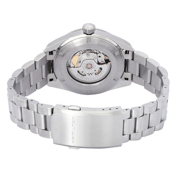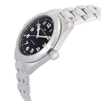 Silver-tone stainless steel case and bracelet. Fixed silver-tone stainless steel bezel. Black dial with silver-tone hands and Arabic numeral hour markers. Minute markers around the outer rim. Dial Type: Analog. Luminescent hands and markers. Hamilton Calibre H-10 Automatic movement, based upon ETA C07.111, containing 25 Jewels, bitting at 21600 vph, and has a power reserve of approximately 80 hours. Scratch resistant sapphire crystal. Screw down crown. Transparent case back. Round case shape, case size: 41 mm, case thickness: 11.5 mm. Band width: 20 mm. Fold over clasp with a safety release. Water resistant at 100 meters / 330 feet. Functions: hour, minute, second. Khaki Field Series. Sport watch style. Watch label: Swiss Made. Hamilton Khaki Field Expedition Automatic Black Dial Men's Watch H70315130.