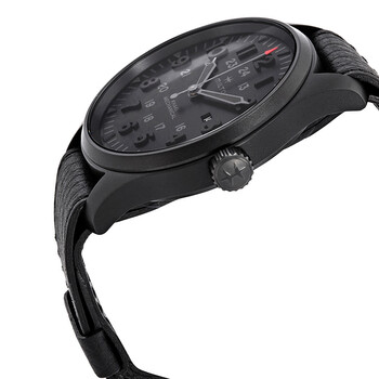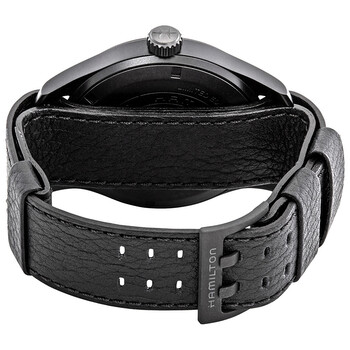 Black PVD stainless steel case with a black (cowskin) leather strap. Fixed black PVD bezel. Black dial with luminour black hands and Arabic numeral hour markers. 24 hour markers. Minute markers around the outer rim. Dial Type: Analog. Luminescent hands and markers. Date display at the 3 o'clock position. Hamilton calibre H-50 hand wind movement with an 80-hour power reserve. Scratch resistant sapphire crystal. Pull / push crown. Solid case back. Round case shape. Case size: 50 mm. Case thickness: 12.55 mm. Band width: 24 mm. Tang clasp. Water resistant at 100 meters / 330 feet. Functions: date, hour, minute, second, 24 hours. Additional Info: limited to only 550 pieces. Luxury watch style. Watch label: Swiss Made. Hamilton Khaki Field Hand Wound Black Dial Men's Watch H69809730.