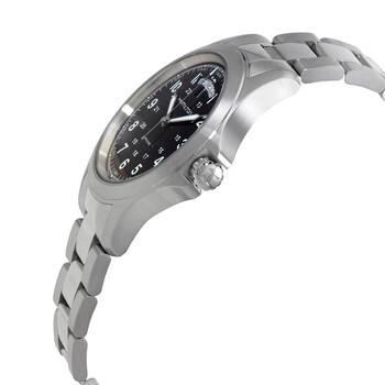 Stainless steel case with a stainless steel bracelet. Fixed stainless steel bezel. Black dial with luminous silver-tone hands and Arabic numeral hour markers. 24 hour markers. Arabic numeral minute markers (at 5 minute intervals). Minute markers around the outer rim. Dial Type: Analog. Luminescent hands and markers. Day of the week and date display centered on the 12 o'clock position. ETA caliber 955.132 quartz movement. Scratch resistant sapphire crystal. Solid case back. Round case shape. Case size: 40 mm. Case thickness: 11 mm. Band width: 20 mm. Fold over clasp. Water resistant at 50 meters / 165 feet. Functions: date, day, hour, minute, second, battery eol indicator. Khaki Field King Series. Military watch style. Hamilton Khaki Field King Quartz Black Dial Men's Watch H64451133.