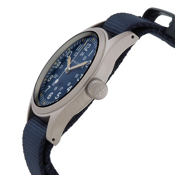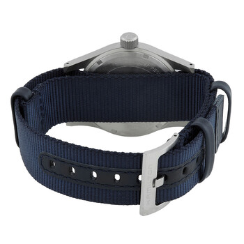 Silver-tone stainless steel case with a black textile strap. Fixed silver-tone stainless steel bezel. Blue dial with silver-tone hands and Arabic numeral hour markers. Minute scale around the inner rim. Dial Type: Analog. Luminescent hands and markers. Hamilton Calibre H-50 manual wind movement, based upon ETA 2801-2, containing 17 Jewels, bitting at 21600 vph, and has a power reserve of approximately 80 hours. Scratch resistant sapphire crystal. Round case shape, case size: 38 mm, case thickness: 9.5 mm. Band width: 20 mm. Tang clasp. Water resistant at 50 meters / 165 feet. Functions: hour, minute, second. Khaki Field Series. Sport watch style. Watch label: Swiss Made. Hamilton Khaki Field Manual Wind Blue Dial Men's Watch H69439940.