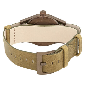 Green PVD stainless steel case with a green (cowhide) leather strap. Fixed green PVD bezel. Green dial with luminous silver-tone hands and Arabic numeral hour markers. 24 hour markers. minute markers around the outer rim. Dial Type: Analog. Luminescent hands and markers. Hamilton calibre H-50 hand wind movement, based upon ETA 2801-2, containing 17 Jewels, bitting at 21600 vph, and has a power reserve of approximately 80 hours. Scratch resistant sapphire crystal. Pull / push crown. Solid case back. Round case shape. Case size: 38 mm. Case thickness: 9.5 mm. Band width: 20 mm. Tang clasp. Water resistant at 50 meters / 165 feet. Functions: hour, minute, second. Casual watch style. Watch label: Swiss Made. Hamilton Khaki Field Mechanical Men's Watch H69449861.