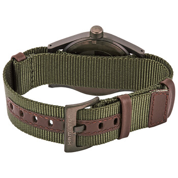 Brown PVD stainless steel case with a green textile strap. Fixed brown PVD bezel. Brown dial with luminous silver-tone hands and Arabic numeral hour markers. 24 hour markers. Minute markers around the outer rim. Dial Type: Analog. Luminescent hands and markers. Hamilton calibre H-50 hand wind movement with an 80-hour power reserve. Scratch resistant sapphire crystal. Pull / push crown. Solid case back. Round case shape. Case size: 38 mm. Case thickness: 9.5 mm. Band width: 20 mm. Tang clasp. Water resistant at 50 meters / 165 feet. Functions: hour, minute, second. Casual watch style. Watch label: Swiss Made. Hamilton Khaki Field Men's Hand Wound Watch H69449961.