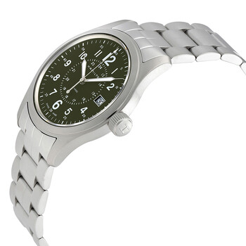 Stainless steel case with a stainless steel bracelet. Fixed stainless steel bezel. Olive green dial with luminous silver-tone hands and Arabic numeral hour markers. 24 hour markers. Minute markers around the outer rim. Dial Type: Analog. Luminescent hands and markers. Date display at the 3 o'clock position. ETA caliber F06.111 quartz movement. Scratch resistant sapphire crystal. Screw down crown. Solid case back. Round case shape, case size: 38 mm, case thickness: 10 mm. Band width: 20 mm. Fold over clasp with a push button release. Water resistant at 100 meters / 330 feet. Functions: date, hour, minute, second. Additional Info: suitable for snorkeling as well as swimming but not diving. Casual watch style. Watch label: Swiss Made. Hamilton Khaki Field Olive Green Dial Men's Watch H68201163.