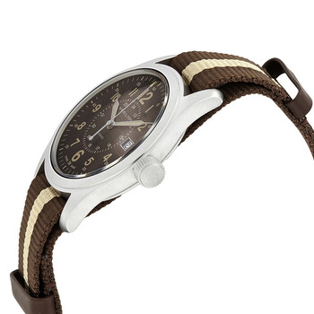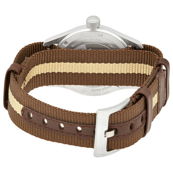 Stainless steel case with a beige and brown nylon NATO strap. Fixed stainless steel bezel. Brown dial with luminous silver-tone hands and Arabic numeral hour markers. 24 hour markers. Arabic numeral minute markers (at 5 minute intervals). Minute markers around the outer rim. Dial Type: Analog. Luminescent hands and markers. Date display at the 3 o'clock position. ETA caliber F06.111 quartz movement. Scratch resistant sapphire crystal. Solid case back. Round case shape. Case size: 38 mm. Case thickness: 9.25 mm. Band width: 20 mm. Tang clasp. Water resistant at 100 meters / 330 feet. Functions: date, hour, minute, second. Casual watch style. Watch label: Swiss Made. Hamilton Khaki Field Quartz Men's NATO Watch H68201093.