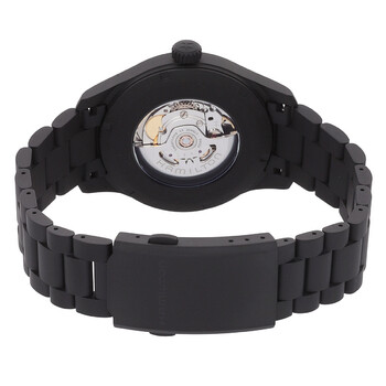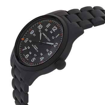 Black PVD titanium case and bracelet. Fixed black PVD titanium bezel. Black dial with black hands and Arabic numeral hour markers. Minute markers around the outer rim. Dial Type: Analog. Luminescent hands and markers. Hamilton Calibre H-10 Automatic movement, based upon ETA C07.111, containing 25 Jewels, bitting at 21600 vph, and has a power reserve of approximately 80 hours. Scratch resistant sapphire crystal. Transparent case back. Round case shape, case size: 42 mm, case thickness: 11.45 mm. Band width: 20 mm. Fold over clasp with a safety release. Water resistant at 100 meters / 330 feet. Functions: hour, minute, second. Khaki Field Series. Sport watch style. Watch label: Swiss Made. Hamilton Khaki Field Titanium Automatic Black Dial Men's Watch H70665130.