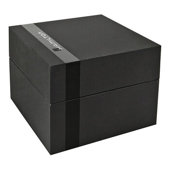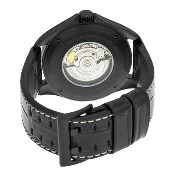 Black PVD stainless steel case with a black leather strap. Fixed black PVD bezel. Black dial with luminous hands and small Arabic numeral hour markers. Arabic numeral minute markers (at 5 minute intervals). Minute markers around the outer rim. Dial Type: Analog. Luminescent hands and markers. Day of the week and date display at the 3 o'clock position. Calibre H-30 automatic movement with a 80-hour power reserve. Scratch resistant sapphire crystal. Screw lock crown. Screw in skeleton case back. Case size: 46 mm. Case thickness: 12 mm. Round case shape. Band width: 22 mm. Tang clasp. Water resistant at 200 meters / 660 feet. Functions: date, day, hour, minute, second. Dress watch style. Watch label: Swiss Made. Hamilton Khaki King Pilot Automatic Men's Watch H64785835.