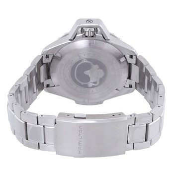 Silver-tone stainless steel case and bracelet. Silver-tone stainless steel bezel. Black dial with silver-tone hands and Arabic numeral & index hour markers. Minute markers around the outer rim. Dial Type: Analog. Luminescent hands and markers. Hamilton Calibre H-10 Automatic movement, based upon ETA C07.111, containing 25 Jewels, bitting at 21600 vph, and has a power reserve of approximately 80 hours. Scratch resistant sapphire crystal. Screw down crown. Round case shape, case size: 46 mm. Fold over clasp with a safety release. Water resistant at 300 meters / 1000 feet. Functions: hour, minute, second. Khaki Navy Frogman Series. Dive watch style. Watch label: Swiss Made. Hamilton Khaki Navy Frogman Automatic Black Dial Men's Watch H77815130.
