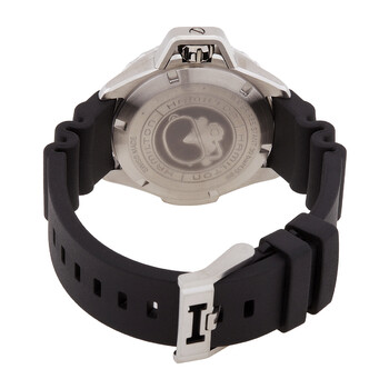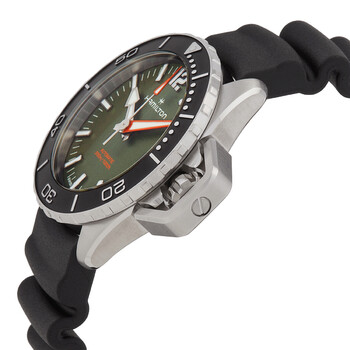 Silver-tone stainless steel case with a black rubber strap. Uni-directional rotating black ceramic bezel. Green dial with silver-tone hands and index hour markers. Minute markers around the outer rim. Dial Type: Analog. Luminescent hands and markers. Hamilton Calibre H-10 Automatic movement, based upon ETA C07.111, containing 25 Jewels, bitting at 21600 vph, and has a power reserve of approximately 80 hours. Scratch resistant sapphire crystal. Screw down crown. Round case shape, case size: 41 mm. Buckle clasp. Water resistant at 300 meters / 1000 feet. Functions: hour, minute, second. Khaki Navy Frogman Series. Dive watch style. Watch label: Swiss Made. Hamilton Khaki Navy Frogman Automatic Green Dial Men's Watch H77455360.