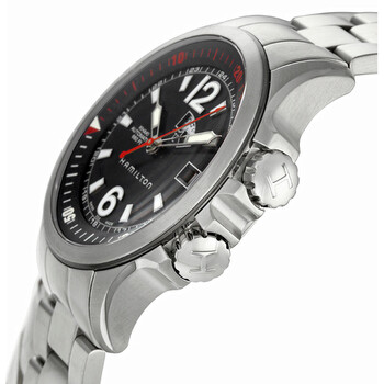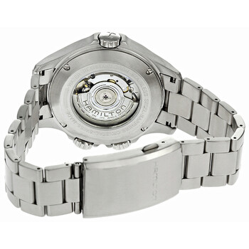 Stainless steel case with a stainless steel bracelet. Fixed stainless steel bezel. Black dial with luminous hands and stick hour markers. Arabic numerals mark the 6 and 12 o'clock positions. 24 hour markings. Minute markers. Dial Type: Analog. Luminescent hands and markers. Date display at the 3 o'clock position. Self winding automatic movement. Scratch resistant sapphire crystal. Screw down crown. Skeleton case back. Case diameter: 42 mm. Case thickness: 12 mm. Band width: 20 mm. Deployment clasp. Water resistant at 200 meters / 660 feet. Functions: hours, minutes, seconds, date, GMT time, city display. Luxury Sport watch style. Watch label: Swiss Made. Hamilton Khaki Navy GMT Men's Watch H77555135.