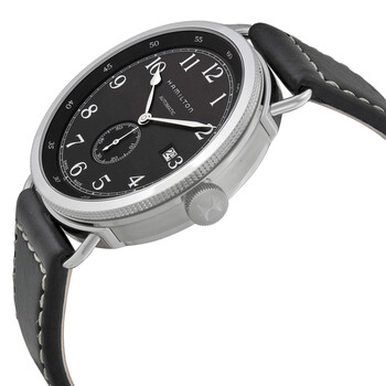 Stainless steel case with a black leather strap. Fixed stainless steel bezel. Black dial with silver-tone hands and Arabic numeral hour markers. Minute markers. Arabic numeral minute markers (at 5 minute intervals) around the outer rim. Dial Type: Analog. Date display at the 3 o'clock position. Small seconds sub-dial. ETA caliber 2895-2 automatic movement, based upon ETA 2892-A2, containing 27 Jewels, bitting at 28800 vph, and has a power reserve of approximately 42 hours. Scratch resistant sapphire crystal. Pull / push crown. Transparent case back. Round case shape. Case size: 40 mm. Case thickness: 7 mm. Band width: 20 mm, band length: 7 inches. Tang clasp. Water resistant at 100 meters / 330 feet. Functions: date, hour, minute, second. Khaki Navy Pioneer Series. Dress watch style. Watch label: Swiss Made. Hamilton Khaki Navy Pioneer Automatic Black Dial Men's Watch H78415733.
