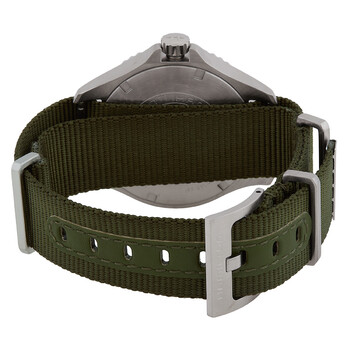 Silver-tone stainless steel case with a green NATO band. Uni-directional rotating green stainless steel bezel. Green dial with silver-tone hands and index hour markers. Minute markers around the outer rim. Dial Type: Analog. Luminescent hands and markers. Date display between 4 and 5 o'clock position. Quartz movement with an 80-hour power reserve. Scratch resistant sapphire crystal. Screw down crown. Solid case back. Round case shape, case size: 40 mm, case thickness: 12.95 mm. Band width: 20 mm. Buckle clasp. Water resistant at 100 meters / 330 feet. Functions: date, hour, minute, second. Khaki Navy Series. Sport watch style. Watch label: Swiss Made. Hamilton Khaki Navy Quartz Green Dial Watch H82241961.