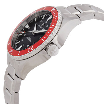 Silver-tone stainless steel case and bracelet. Uni-directional rotating red aluminum bezel. Black dial with silver-tone hands and index hour markers. Minute markers around the outer rim. Dial Type: Analog. Luminescent hands and markers. Date display between 4 and 5 o'clock position. Hamilton Calibre H-10 Automatic movement, based upon ETA C07.111, containing 25 Jewels, bitting at 21600 vph, and has a power reserve of approximately 80 hours. Scratch resistant sapphire crystal. Screw down crown. Solid case back. Round case shape, case size: 40 mm, case thickness: 12.95 mm. Band width: 20 mm. Fold over clasp with a safety release. Water resistant at 100 meters / 330 feet. Functions: date, hour, minute, second. Khaki Navy Series. Sport watch style. Watch label: Swiss Made. Hamilton Khaki Navy Scuba Automatic Black Dial Watch H82405130.